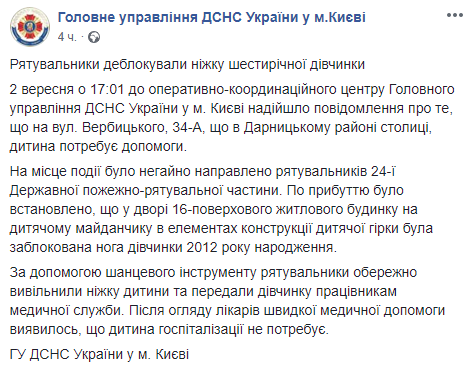 В Киеве, 2 сентября, спасатели освободили ножку шестилетней девочки, которая застряла на детской площадке в Дарницком районе. Об этом сообщила пресс-служба ГосЧС столицы в Facebook