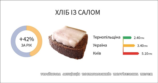 Украинский бутерброд с салом за последний год подорожал на 42%. Об этом сообщил гендиректор украинской ассоциации поставщиков торговых сетей Алексей Дорошенко в Facebook.