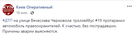 В Киеве вечером, 3 сентября, троллейбус, следовавший по улице Вячеслава Черновола по непонятным причинам врезался в полицейский автомобиль. Судя по фото, размещенным в группе Киев Оперативный, полицейскую машину развернуло перпендикулярно движению троллейбуса. Однако, причина аварии неясна.