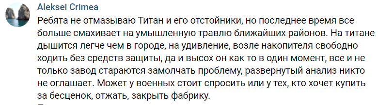 "Ребята не отмазываю Титан и его отстойники, но последнее время все больше смахивает на умышленную травлю ближайших районов. На титане дышится легче чем в городе, на удивление, возле накопителя свободно ходить без средств защиты, да и высох он как то в один момент, все и не только завод стараются замолчать проблему, развернутый анализ никто не оглашает. Может у военных стоит спросить или у тех, кто хочет купить за бесценок, отжать, закрыть фабрику", - предполагает другой пользователь того же паблика.