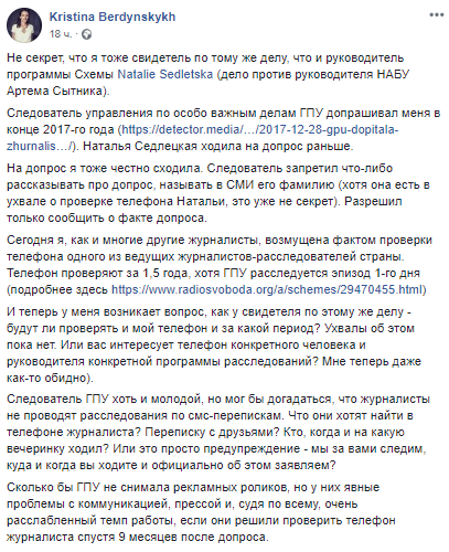 "Сегодня я, как и многие другие журналисты, возмущена фактом проверки телефона одного из ведущих журналистов-расследователей страны. Телефон проверяют за 1,5 года, хотя ГПУ расследуется эпизод 1-го дня. И теперь у меня возникает вопрос, как у свидетеля по этому же делу - будут ли проверять и мой телефон и за какой период? Ухвалы об этом пока нет. Или вас интересует телефон конкретного человека и руководителя конкретной программы расследований? Мне теперь даже как-то обидно", - написала Бердинских.