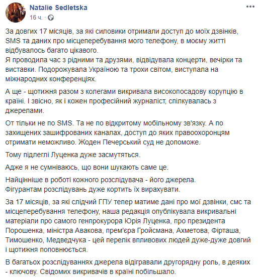 "Имею просьбу к журналисту "Радио "Свобода"" Natalie Sedletska, которая, как мы теперь знаем, неофициально встречается с директором Национального антикоррупционного бюро Артемом Сытником и обсуждает с ним информацию об интимной жизни посторонних лиц, полученную НАБУ путем незаконного прослушивания телефонов (в частности - путем прослушивания телефона гражданки Ирины Немец). Поскольку я не принадлежу к числу тех людей, которые могут задать вопрос Сытнику, то - как журналист, ранее также работал на Радио "Свобода" - прошу Наталью во время следующей встречи спросить у Артема Сергеевича, на основании чего Национальное антикоррупционное бюро Украины в сентябре-