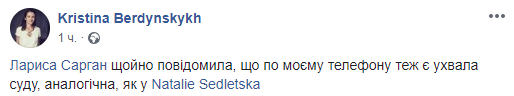 Однако позже выяснилось, что по телефону Бердинских также есть аналогичное судебное решение. Об этом журналистке сообщила пресс-секретарь Юрия Луценко Лариса Сарган.