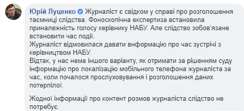 "Журналист является свидетелем по делу о разглашении тайны следствия. Фоноскопическая экспертиза установила принадлежность голоса руководителю НАБУ. Но следствие обязано установить время события. Журналист отказалась давать информацию о времени встречи с руководством НАБУ.