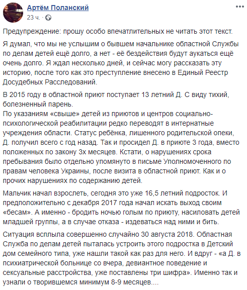 Поланский рассказал, что проблемы проявились, когда мальчик начал взрослеть. "Предположительно, с декабря 2017 года он начал искать выход своим "бесам". А именно - бродить ночью голым по приюту, насиловать детей младшей группы, а в случае отказа - издеваться над ними и бить", - написал он.