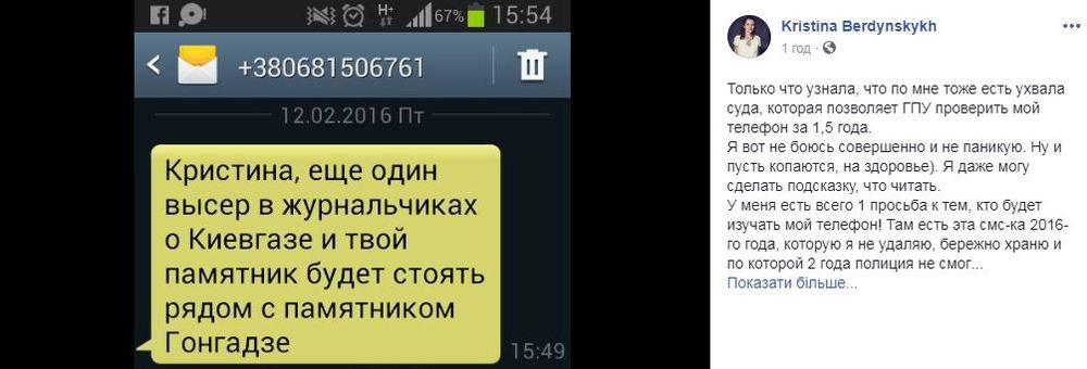 Генеральная прокуратура Украины  получила разрешение суда на проверку сообщений, разговоров и перемещения телефона журналистки издания "Новое время" Кристины Бердинских. Об этом она сама сообщила на своей странице в соцсети.