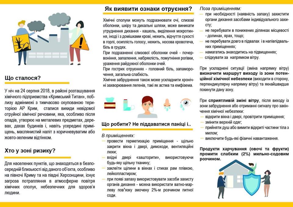 Так, в листовках рекомендуется находиться в помещениях или покинуть опасную зону. Овощи и фрукты рекомендуют промывать слабым 2%-м мыльно-содовым раствором. Из трех КПВВ на админгранице с Крымом сейчас работает только "Чонгар", пострадавших от химического отравления должны пропускать по ускоренной процедуре, говорится в листовках.
