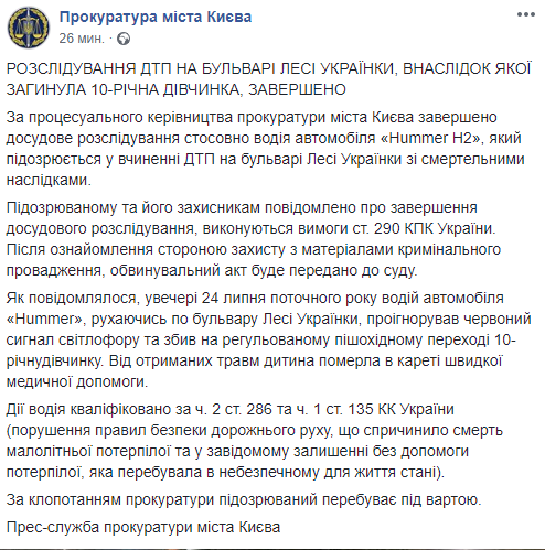 Прокуратура Киева завершила расследование в деле о смертельном ДТП на бульваре Леси Украинки, в результате которого погибла 10-летняя девочка. Об этом сообщает пресс-служба ведомства в Facebook.