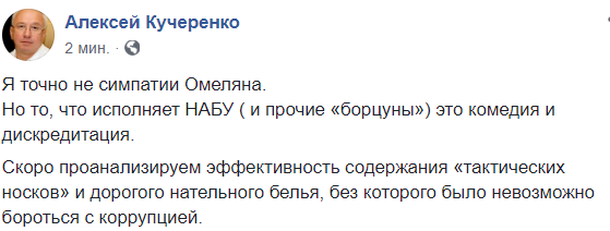 Скоро проанализируем эффективность содержания "тактических носков" и дорогого нательного белья, без которого было невозможно бороться с коррупцией", - пишет он.