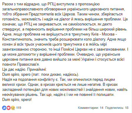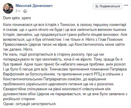 После решения патриарха Константинопольского Варфоломея о назначении своих экзархов в Киев и остановки молитвенного общения Москвы и Константинополя, раскол между ними еще не произошел.