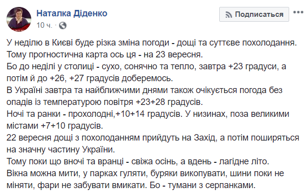 В это воскресенье, 23 сентября, в Киеве ожидается резкое изменение погоды - дожди и существенное похолодание. Об этом в Facebook сообщает синоптик Наталья Диденко.