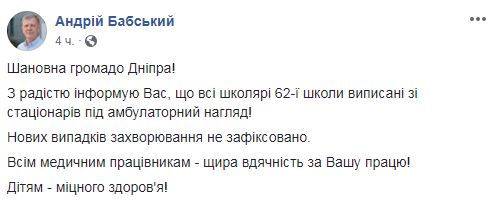 В то же время, как сообщил директор департамента охраны здоровья населения Днепровского городского совета Андрей Бабский, всех учеников школы №62, которые попали в больницу с заболеванием, выписали из стационаров. По его словам, новых случаев заболевания не зафиксировано.