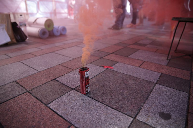 Митингующие держат в руках плакаты "Ми хочемо жити", а также зажгли фаеры и дымовые шашки. Площадь Конституции затянуло красным дымом.