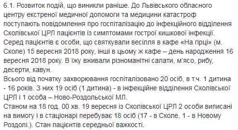 Сообщается, что часть пострадавших праздновали в кафе "На гірці" (город Сколе) свадьбу 15 сентября, затем уже другие посетители 16 сентября отмечали день рождения. В пищу употребляли салаты, мясо, рыбу, десерты, арбуз.