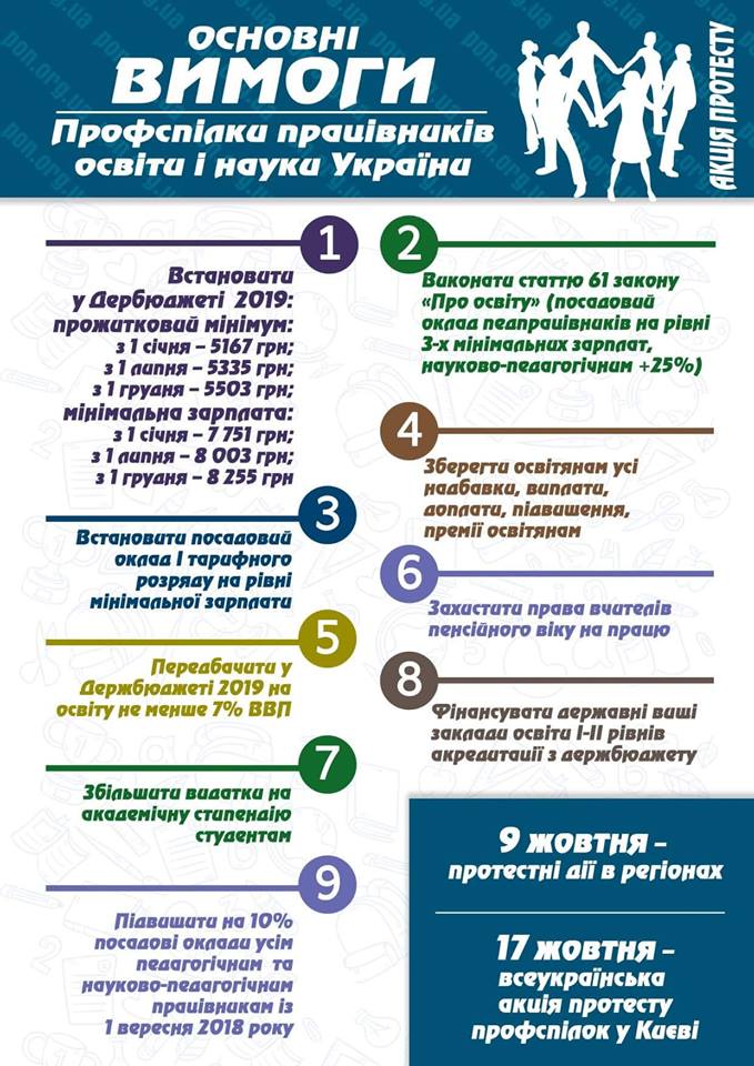 Федерация работников образования и науки Украины также опубликовала и профильные требования. В частности, педагоги потребовали исполнения нормы закона "Об образовании" об окладе в размере 3-х минимальных зарплат, сохранения надбавок, защиты права учителей пенсионного возраста на труд, увеличения академических стипендий для студентов и повышения зарплаты с 1 сентября 2018 года. Также они призвали увеличить прожиточный минимум в Украине до 5167 гривен.