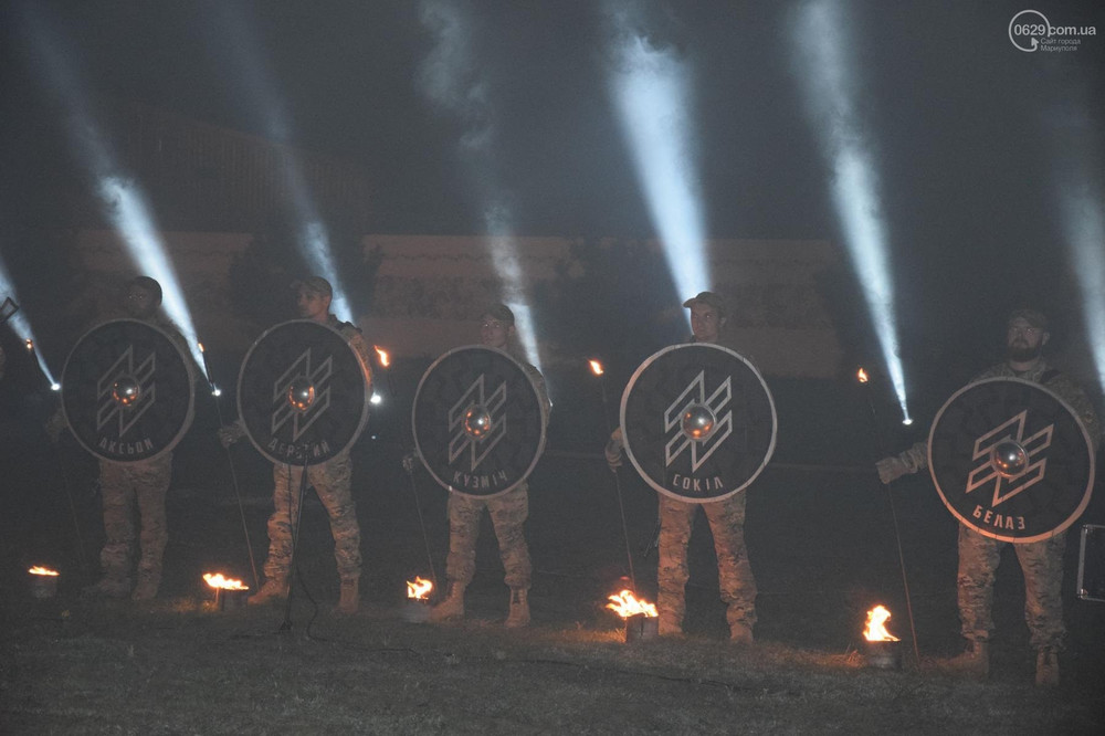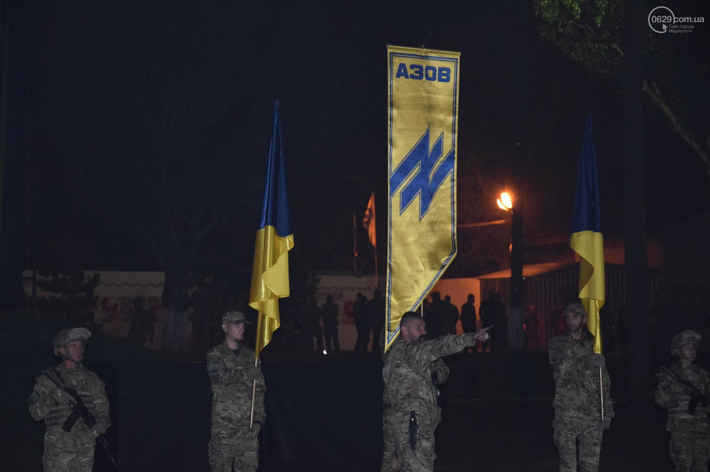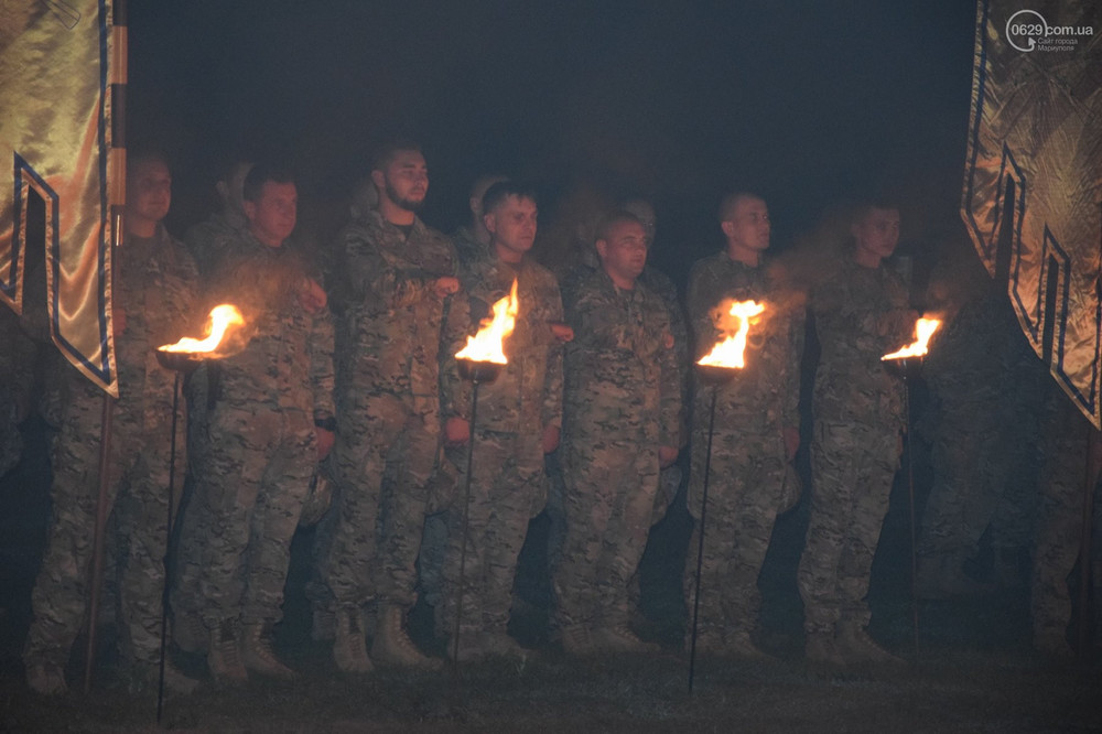 Была разыграна настоящая мистерия. Все подразделения полка выстроились на поле под своими штандартами, затем при свет факелов прошла молитва украинского националиста. Под эпическую музыку вышла щитоносная группа. На каждом из 35 щитов был написан позывной погибшего добровольца. Особенность церемонии в этом году состояла в том, что вспоминали не только  погибших в боях азовцев, но и тех, кто служил в полку ранее, а после перешел в другие батальоны и был убит на Донбассе. Вспоминали и азовцев, погибших в результате несчастных случаев.