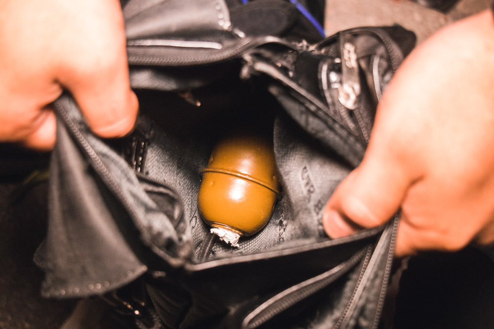 Правоохранителям удалось догнать Peugeot и остановить его. В машине находились двое мужчин. В ходе разбирательств было установлено, что это таксист и пассажир Евгений. При осмотре личных вещей пассажира были обнаружены наручники, предмет похожий на пистолет и гранату.