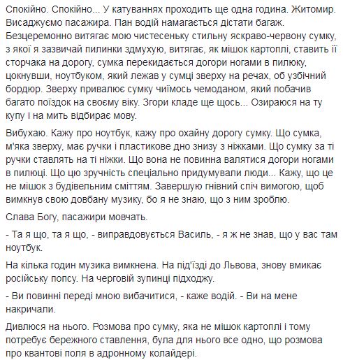 Спустя некоторое время она все же не выдержала и попросила водителя включить другую музыку, однако он сказал, что таковой не имеется и продолжил слушать попсу на полную громкость. Однако после того, как во время высадки одного из пассажиров в Житомире водитель уронил дорогую сумку Ницой с ноутбуком, писательница высказала ему свое недовольство его отношением к пассажирам и заставила выключить навязчивую музыку.