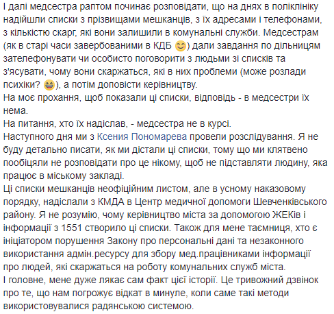 "Эти списки жителей пришли в неофициальном письме, но в устном приказном порядке, прислали из КГГА в Центр медицинской помощи Шевченковского района. Я не понимаю, почему руководство города с помощью ЖЭКов и информации с 1551 создало эти списки", - пишет Коптенкова.