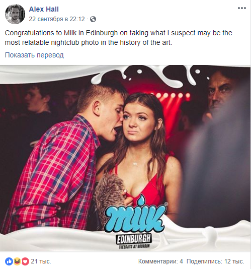 В соцсетях опубликовали фото из ночного клуба Bourbon в Эдинбурге, где парень пытается пообщаться со скучающей девушкой. Снимок вдохновил юзеров на создание интернет-мемов. Первым на изображение обратил внимание житель Лондона Алекс Холл в Facebook.