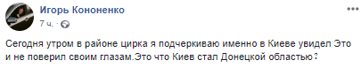 "Утром увидел ЭТО в районе цирка и не поверил своим глазам. Это что, Киев стал Донецкой области?" - удивляется пользователь соцсети Игорь Кононенко.