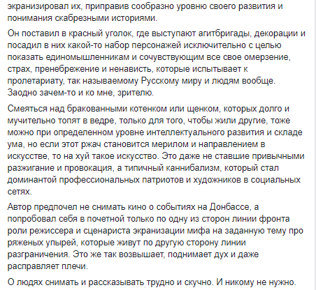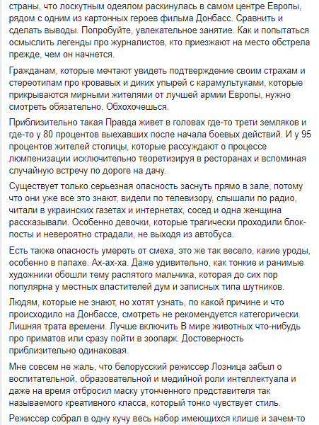 "Я ни разу не театральный или кинематографический критик. Посмотрел как бы #фильм #Донбасс, который снял замечательный белорусский #режиссер #Лозница как бы по документальным свидетельствам и основанный как бы на реальных событиях. Это сейчас как бы модно.