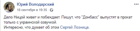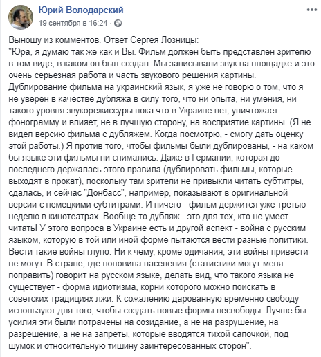 "Юра, я думаю так же как и Вы. Фильм должен быть представлен зрителю в том виде, в каком он был создан. Мы записывали звук на площадке и это очень серьезная работа и часть звукового решения картины. Дублирование фильма на украинский язык, я уже не говорю о том, что я не уверен в качестве дубляжа в силу того, что ни опыта, ни умения, ни такого уровня звукорежиссуры пока что в Украине нет, уничтожает фонограмму и влияет, не в лучшую сторону, на восприятие картины. (Я не видел версию фильма с дубляжем. Когда посмотрю, - смогу дать оценку этой работы.) Я против того, чтобы фильмы были дублированы, - на каком бы языке эти фильмы ни снимались. Даже в Германии, которая до последнего держалась этого правила (дублировать фильмы, которые выходят в прокат), поскольку там зрители не привыкли читать субтитры, сдалась, и сейчас "Донбасс", например, показывают в оригинальной версии с немецкими субтитрами. И ничего - фильм держится уже третью неделю в кинотеатрах. Вообще-то дубляж - это для тех, кто не умеет читать! У этого вопроса в Украине есть и другой аспект - война с русским языком, которую в той или иной форме пытаются вести разные политики. Вести такие войны глупо. Ни к чему, кроме одичания, эти войны привести не могут. В стране, где половина населения (статистики могут меня поправить) говорит на русском языке, делать вид, что такого языка не существует - форма идиотизма, корни которого можно поискать в советских традициях лжи. К сожалению дарованную временно свободу используют для того, чтобы создать новые формы несвободы. Лучше бы усилия эти были потрачены на созидание, а не на разрушение, на разрешение, а не на запреты, которые вводятся тихой сапочкой, под шумок и относительную тишину заинтересованных сторон".