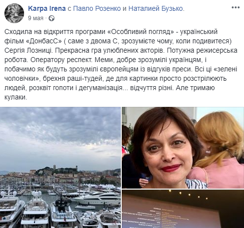 "Сходила на открытие программы "Особый взгляд" - украинский фильм "Донбасс" (именно с двумя С, поймете почему, когда посмотрите) Сергея Лозницы. Прекрасная игра любимых актеров. Мощная режиссерская работа. Оператору респект. Мемы, хорошо понятны украинцам и увидим как будут понятны европейцам из отзывов прессы. Все эти "зеленые человечки", ложь раши-тудей, где для картинки просто расстреливают людей, расцвет гопоты и дегуманизация ... ощущение разные. Но держу кулаки", - написала она перед тем, как стало известно, что "Донбасс" получил награду за режиссерскую работу в рамках "Особого взгляда".