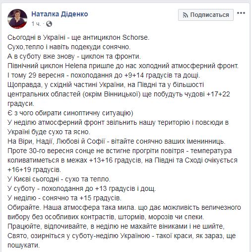 "Работайте, отдыхайте, в воскресенье не машите вениками и не шейте. Праздник (День Веры, Надежды, Любви - Прим. Ред.), оглянитесь в субботу-воскресенье по Украине - такой красоты, как сейчас, еще поискать", - резюмирует Диденко.