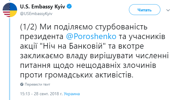 "Мы разделяем обеспокоенность президента Петра Порошенко и участников акции "Ночь на Банковой" и в очередной раз призываем власти решать многочисленные вопросы недавних преступлений против общественных активистов", - говорится в сообщении посольства США.