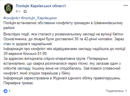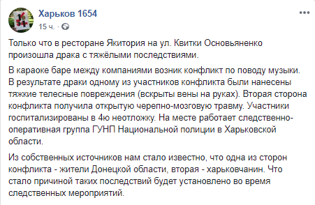 Так, по информации свидетелей происшествия, конфликт разгорелся в караоке на улице Квитки-Основьяненко. Как сообщила позже пресс-служба полиции, причиной ссоры стала музыка. Один из клиентов заведения заказал песню, что не понравилось другому мужчине. Словесная перепалка быстро переросла в драку. В результате обе стороны конфликта, 30-летний и 42-летний мужчины, пострадали. У одного из них порезаны запястья, второй получил черепно-мозговую травму.