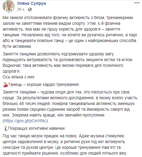 Глава Минздрава Ульяна Супрун посоветовала украинцам заниматься танцами, чтобы улучшить физическую активность и социальные навыки. Об этом она написала на своей странице в Facebook.