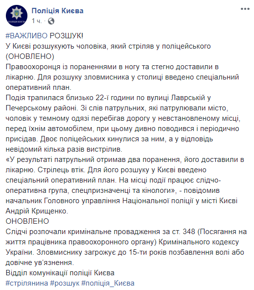 "В результате патрульный получил два ранения, его доставили в больницу. Стрелок убежал. Для его розыска в Киеве введен специальный оперативный план. На месте происшествия работает следственно-оперативная группа, спецназовцы и кинологи" - сообщил начальник Главного управления Национальной полиции в городе Киеве Андрей Крищенко.