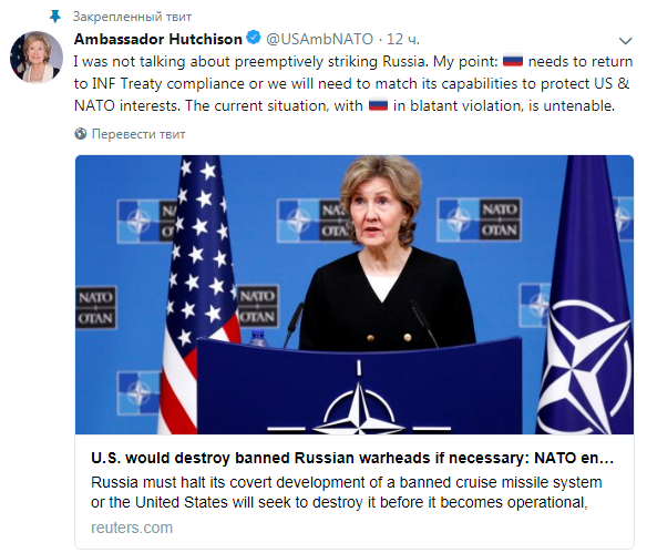 В частности постоянный представитель США при НАТО Кей Бейли Хатчисон рассказала, что контрмеры будут направлены на устранение разрабатываемые Россией в обход Договора ракет наземного базирования большого радиуса действия 9M729.