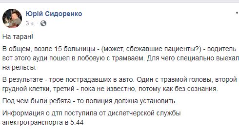 "Возле 15 больницы - (может, сбежавшие пациенты?) - водитель вот этого "Аudi" пошел в лобовую с трамваем. Для чего специально выехал на рельсы", - написал Сидоренко. Он добавил, что информация о ДТП поступила в 05:44 от диспетчерской службы электротранспорта.