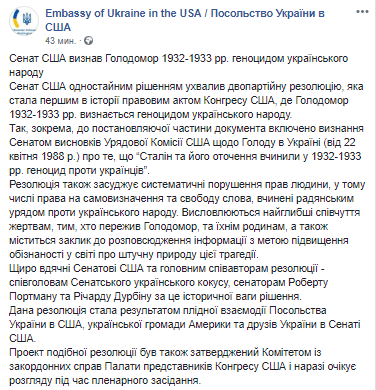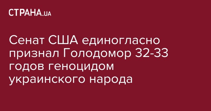 Сенат США единогласно принял двухпартийную резолюцию, которая стала первым в истории правовым актом Конгресса США, где Голодомор 1932-1933 гг признан геноцидом украинского народа. Об этом говорится в сообщении посольства Украины в США в соцсети.