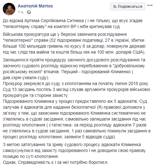 "Осталось пройти процедуру заочного досудебного расследования и заочного судебного разбирательства в отношении находящихся в "добровольном российском изгнании" беглецов. Первый - подозреваемый Клименко. Прокурор обратился в суд с ходатайством (о заочном расследовании) в начале июля", - отметил Матиос.