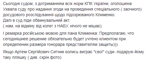 В ближайшее время обвинительный акт против Клименко будет передан в суд.