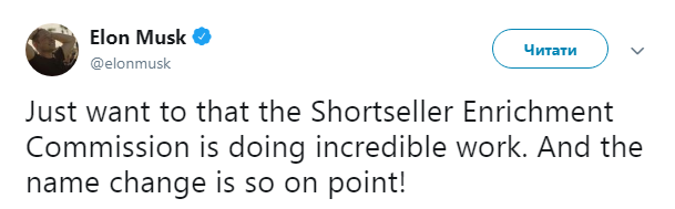 "Просто хочу сказать, что Спекулятивная комиссия по обогащению (Shortseller Enrichment Commission, аббревиатура SEC сохраняется, – Прим.Ред.) делает невероятную работу. И смена названия как раз в тему", – написал Илон Маск.