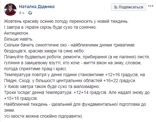 9 октября Украина будет оставаться во власти антициклона, благодаря этому по всей территории страны сохранится сухая и солнечная погода. Об этом сообщила синоптик Наталья Диденко на своей странице в Facebook.