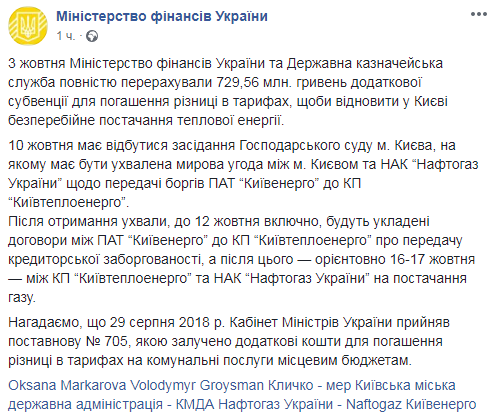 В среду, 3 октября, Министерство финансов Украины и Государственная казначейская служба полностью перечислили 729 млн 560 тыс. грн дополнительной субвенции для погашения разницы в тарифах. Деньги требовались для восстановления бесперебойного снабжения тепловой энергией в Киеве.