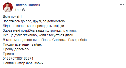 Младший сын украинского певца Виктора Павлика болен раком. Об этом артист написал в посте на своей странице в Facebook.
