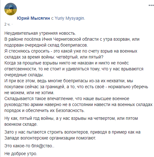 "Неудивительная утренняя новость. В районе поселка Ичня Черниговской области с утра взорван или подорван очередной склад боеприпасов. Я стесняюсь спросить – это какой уже по счету взрыв на военных складах за время войны: четвёртый или пятый?