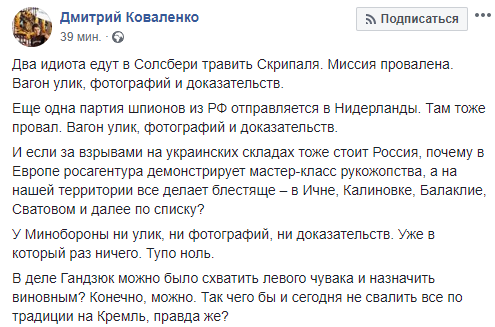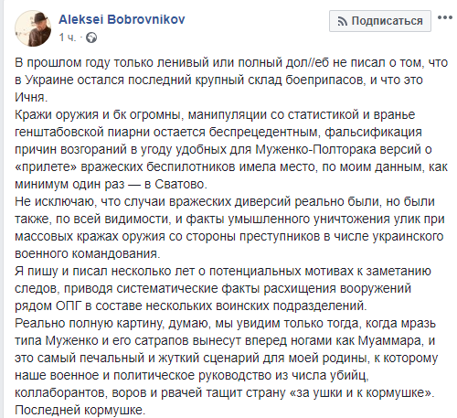 "В Украине взрывается очередной стратегический склад. Таким образом, за каденцию нынешней власти в воздух взлетела тройка крупнейших арсеналов государства. Да, в Украине война и причиной этих взрывов могут быть диверсии. Но в Балаклее и Калиновке виновными были лоси, халатность и козлы отпущения. Охрана складов была усилена только на бумаге. С диверсиями у нас продолжают успешно бороться богатые люди с российским бизнесом. Журналистские расследования о многочисленных злоупотреблениях на складах утонули в море других инфоповодов. Общество молчит. Ему интереснее, кого обматерил очередной политический фрик, а об армии знает, что там с каждым годом растет процент жиров в масле.
