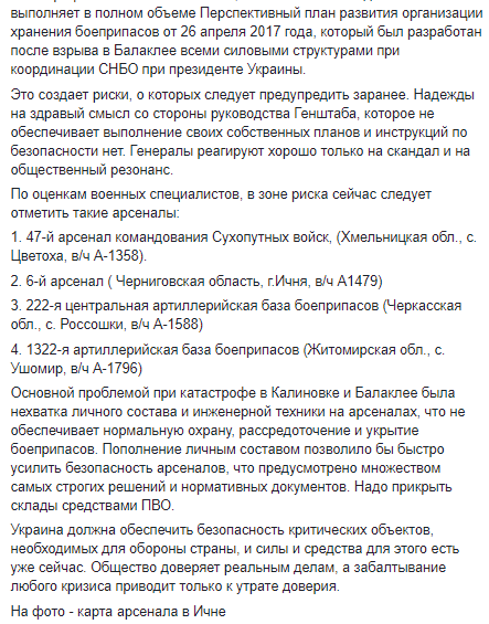 Основной проблемой при катастрофе в Калиновке и Балаклее была нехватка личного состава и инженерной техники на арсеналах, что не обеспечивает нормальную охрану, рассредоточение и укрытие боеприпасов. Пополнение личным составом позволило бы быстро усилить безопасность арсеналов, что предусмотрено множеством самых строгих решений и нормативных документов. Надо прикрыть склады средствами ПВО.