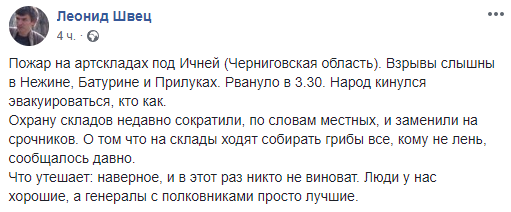"Пожар на артскладах под Ичней (Черниговская область). Взрывы слышны в Нежине, Батурине и Прилуках. Рвануло в 3:30. Народ кинулся эвакуироваться, кто как. Охрану складов недавно сократили, по словам местных, и заменили на срочников. О том, что на склады ходят собирать грибы все кому не лень, сообщалось давно. Что утешает: наверное, и в этот раз никто не виноват. Люди у нас хорошие, а генералы с полковниками просто лучшие".