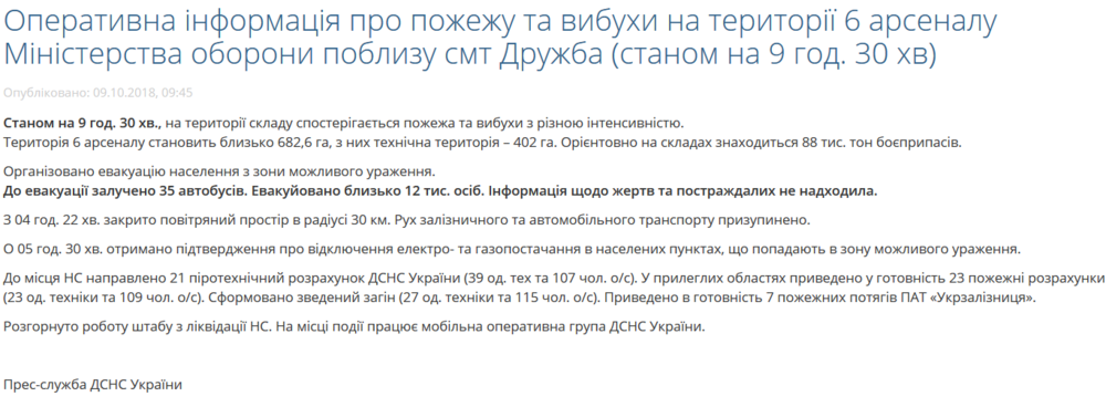 К месту чрезвычайного происшествия направлены 21 пиротехнический расчет ГосЧС Украины (39 единицы техники и 107 человек). В прилегающих областях приведены в готовность 23 пожарных расчета