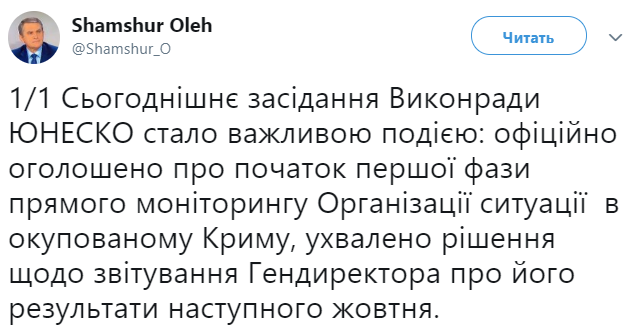 "Сегодняшнее заседание Исполнительного совета ЮНЕСКО стало важным событием: официально объявлено о начале первой фазы прямого мониторинга Организацией ситуации в аннексированном Крыму. Принято решение об отчете гендиректора о его результатах в следующем октябре", - отметил постпред.
