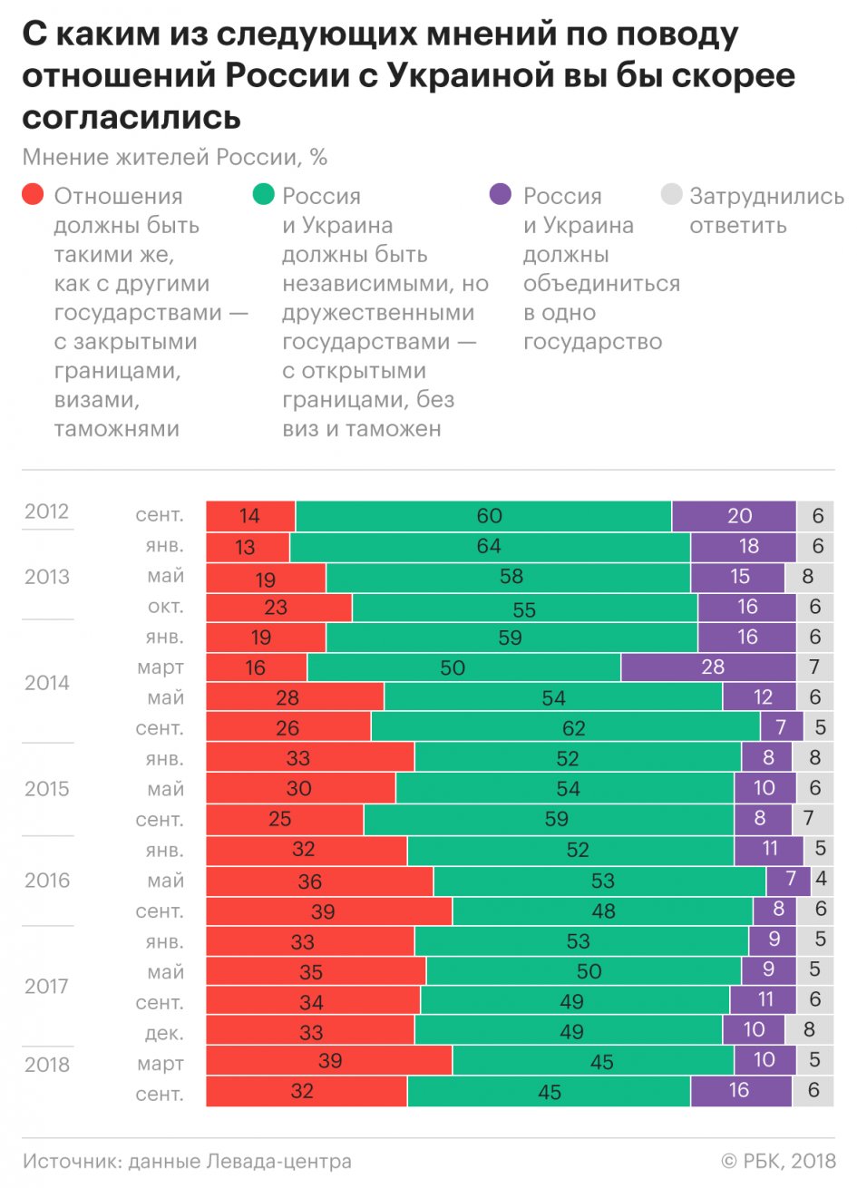 На протяжении многих лет наблюдается асимметрия отношения украинцев к России и россиян к Украине, констатирует руководитель отдела социокультурных исследований Левада-центра. Причем, по словам российского социолога Алексея Левинсона, в РФ наблюдается больше негатива не только по отношению к Украине, но и по отношению к другим странам бывшего Советского Союза. Об этом свидетельствуют исследования отношения к разным странам СНГ. Социолог предполагает, что это может быть связано с тем, что россияне воспринимают все страны СНГ как "совершившие предательство" и покинувшие СССР. "Я бы не сказал, что в данном случае это специфически антиукраинские настроения. Они, безусловно, присутствуют и усилены пропагандой, которую вели в период активных боевых действий в Донбассе, но они тут не главное", - считает эксперт.