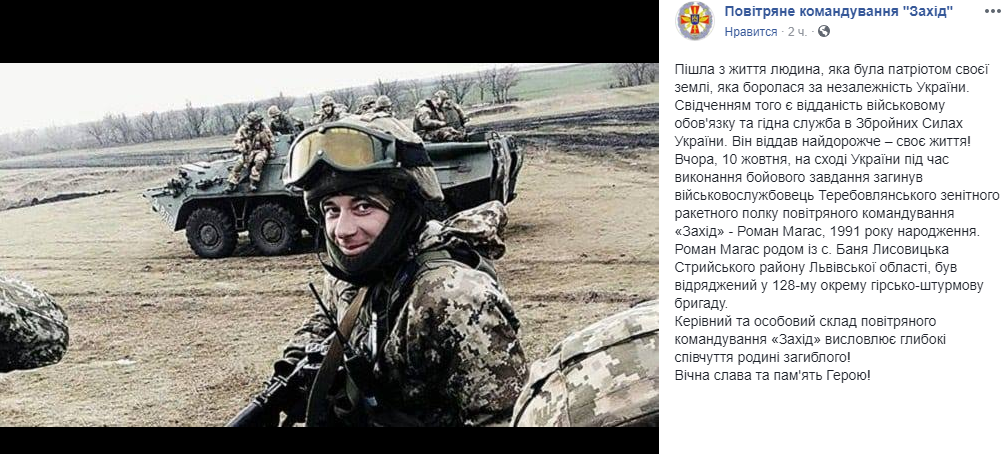 Стали известны имена двух бойцов, погибших 10 октября на Донбассе. Это 27-летний Роман Магас из Львовской области и 20-летний Сергей Дронов из Чигирина Черкасской области. Бойцы подорвались на взрывном устройстве. Об этом сообщается на сайте Львовской ОГА.